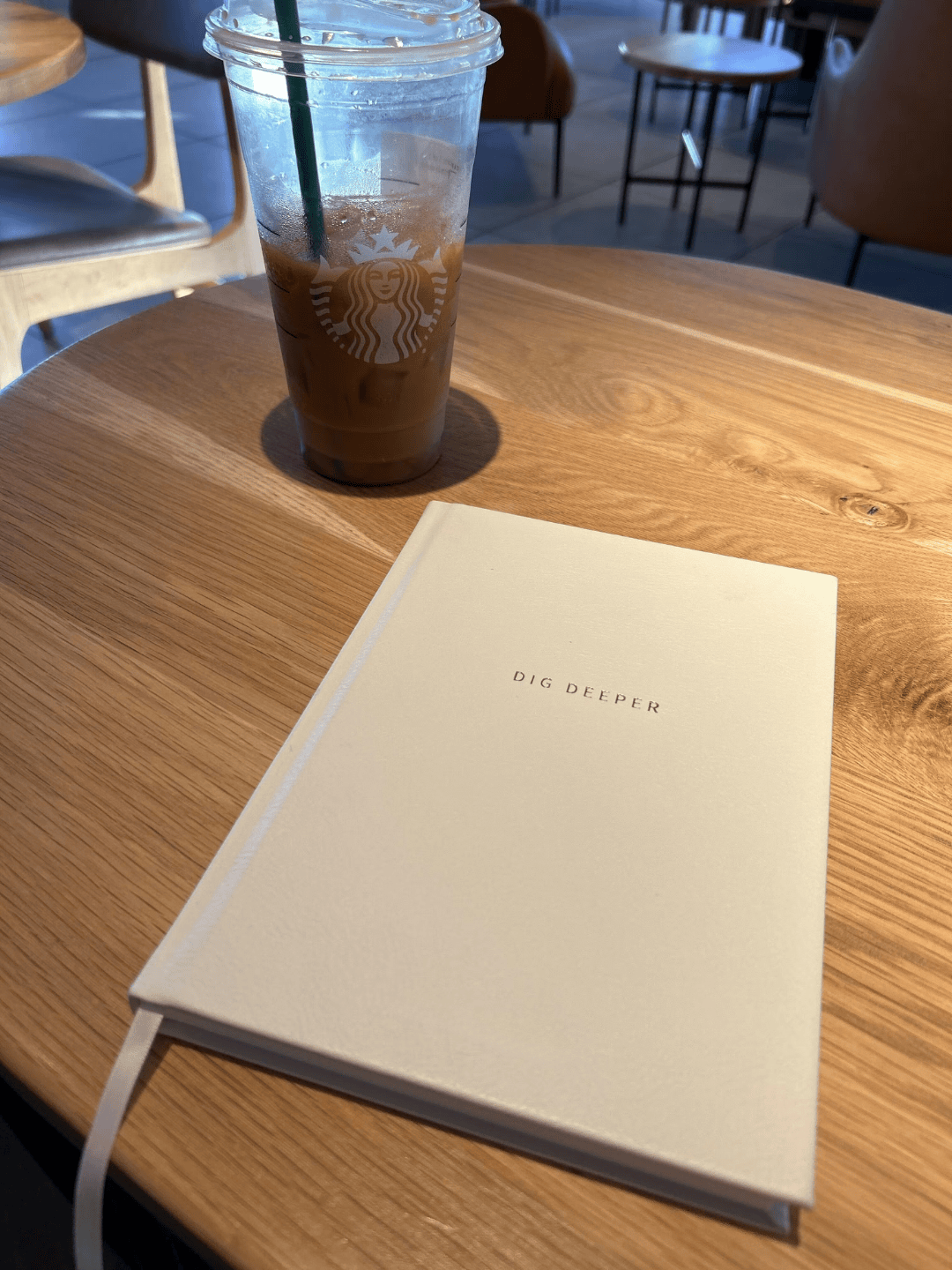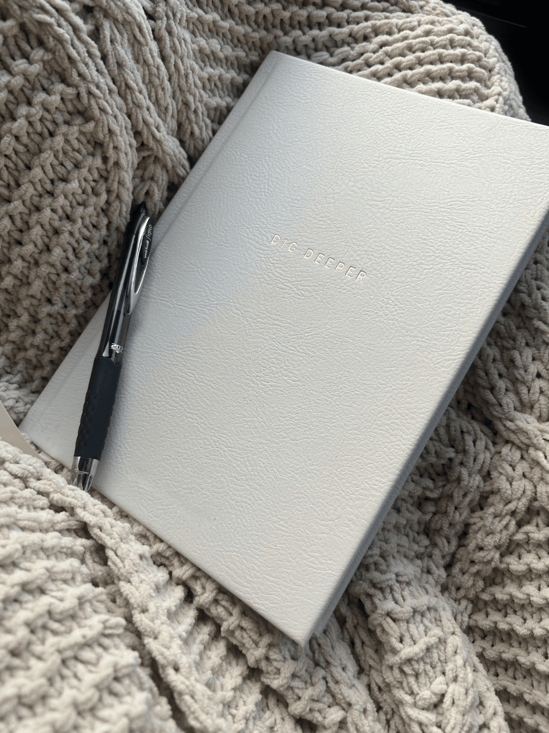 The Dig Deeper Journal is an undated journal with 180 prompts designed to help you get to know yourself on an even deeper level.